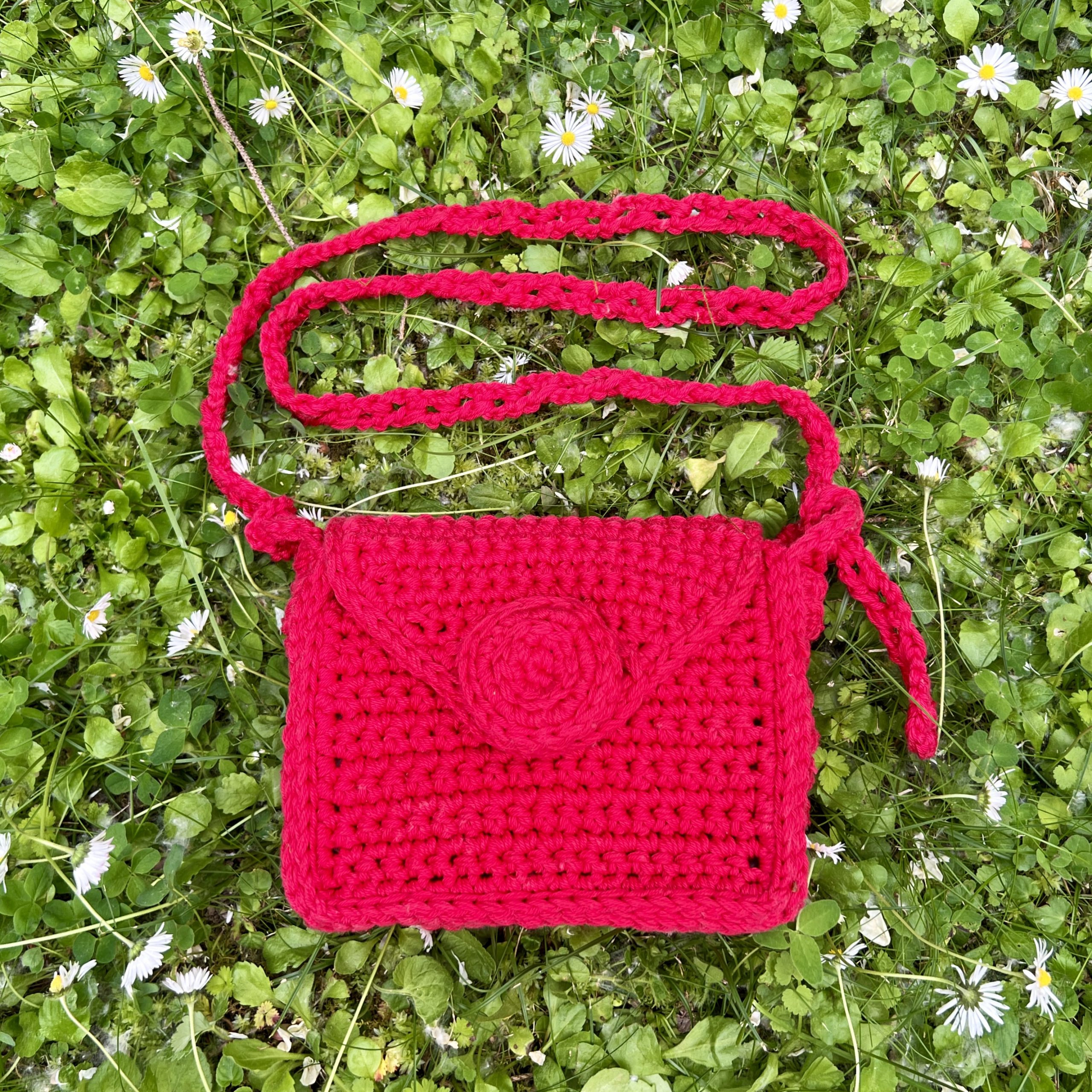A small and extremely versatile crochet bag with a large button on the front. Inside it has a pocket that is well suited for your mobile phone, for example.